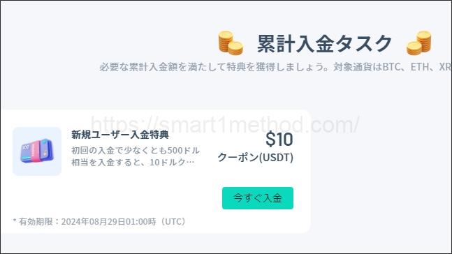 累計入金タスクは、初回入金で$500相当の入金で「$10」のクーポンが配布されます。