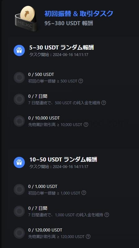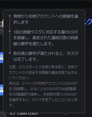 | 口座開設・入金ボーナス | 取引高タスク:$31,615クーポン(USDT) 累計入金タスク:$10クーポン(USDT) |