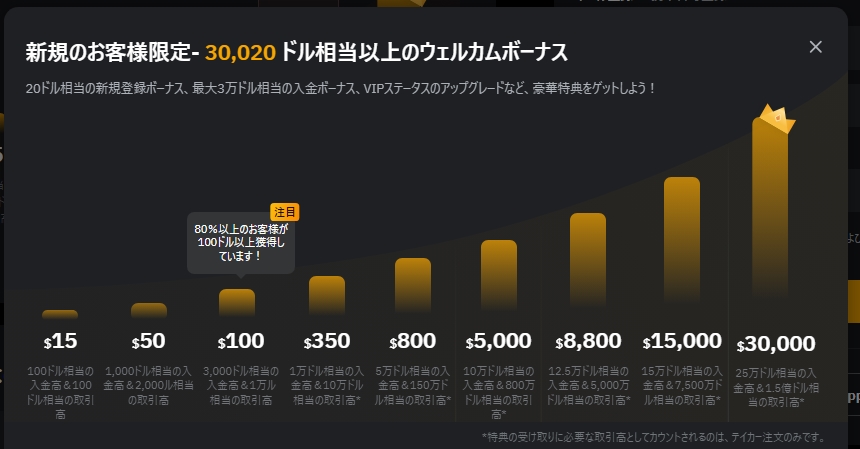 | 口座開設・入金ボーナス | 20ドル+最大3万ドル |