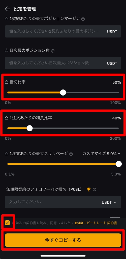 画面下の「コピー」を選択すると、損切り額・利食いなど各項目を設定する画面に移行します。