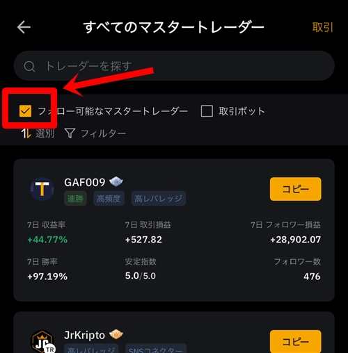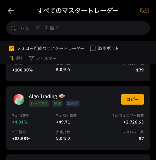 フォロー可能なマスタートレーダーが表示されますので、スクロールしてお目当ての方を探します。