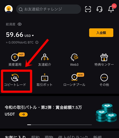 Bybitでは日本語対応のアプリがありますので、そちらのスクショを載せていきます。
