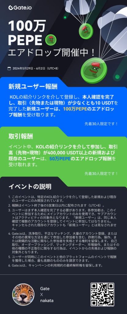 ペペコインのエアドロップを貰うには、当サイトのリンクからGate.io (ゲートアイオー)に登録し、条件をクリアすることによって貰うことができます。(先着30人限定)