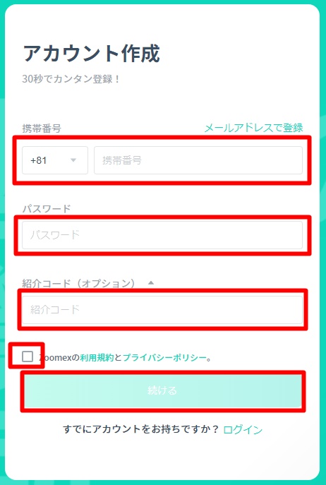紹介コードは自動入力のはずなので、全て入力したら利用規約とプライバシーポリシーを確認してチェックをいれ「続ける」を選択します。